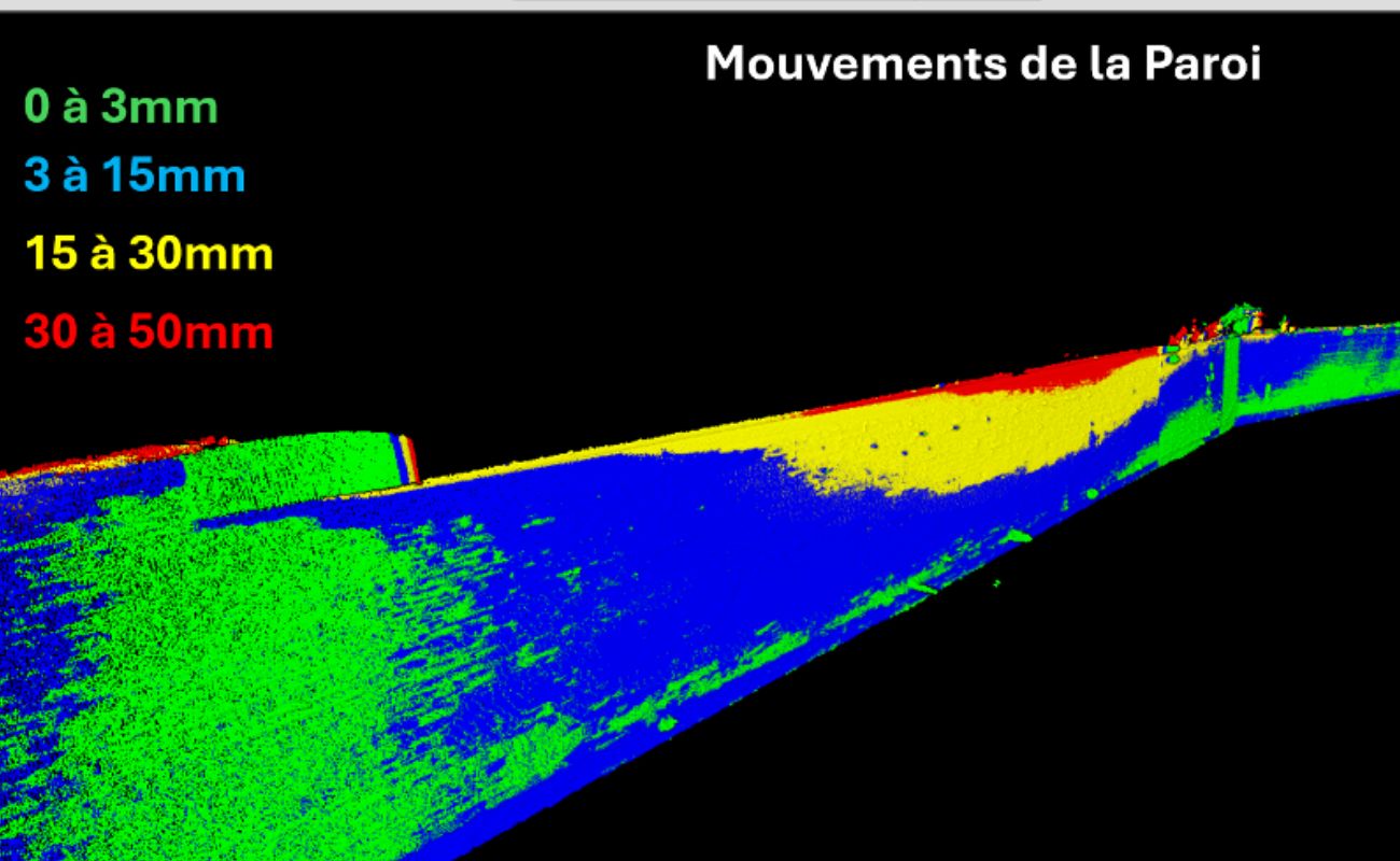 Travaux réalisés : Mise en place d’un réseau géodésique local, relevés d’auscultation via scanner 3D de la paroie de 160 mètres de long et 5m de haut.